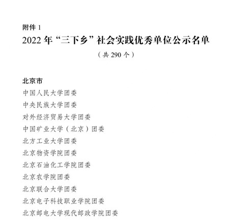 为深入总结交流经验、选树典型宣传推动引领示范、激励广泛参与发挥育人实效,日前,共青团中央通报表扬一批在2022年“三下乡”社会实践活动中表现突出的优秀集体、个人和项目。我校获评2022年“三下乡”社会实践优秀单位,北京市仅有11个单位获评此项荣誉。