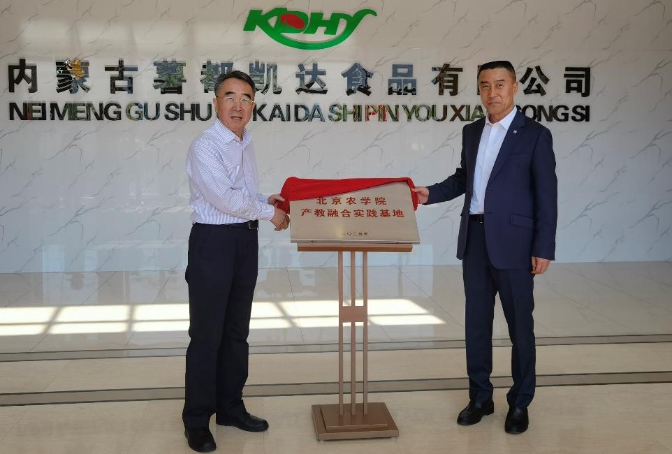 在内蒙古乌兰察布,赵锋一行赴校友企业——内蒙古薯都凯达食品有限公司进行调研,并与企业董事长、全国劳动模范、我校校友刘长安等进行深入交流,签订战略合作协议,共同为“北京农学院产教融合实践基地”揭牌。校企双方将持续推动产学研深度融合,探索专项人才培养模式,构建“技术研发—成果转化—产业应用”一体化平台,共同打造京蒙对口支援产学研合作示范基地,助力京蒙农业协同发展,为全面推进乡村振兴贡献智慧和力量。