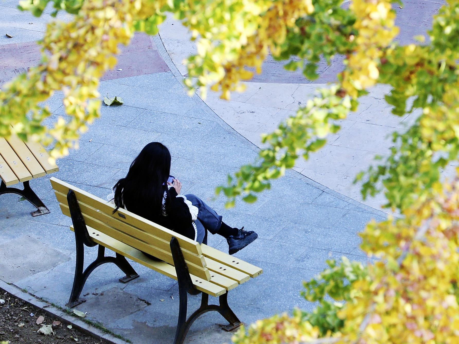 是在草坪旁的长椅读书时