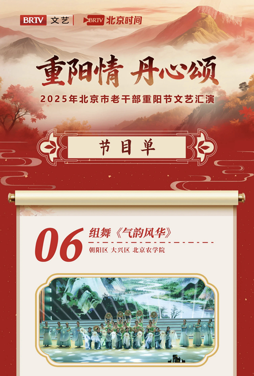 近日,“重阳情 丹心颂”2025年北京市老干部重阳节文艺汇演在北京广播电视台大剧院举行。市委副书记游钧出席并致辞,向全市老同志致以节日问候。我校由离退休教职工组成的“青之荷”舞蹈队,与朝阳区、大兴区的老同志们共同参演了组舞《气韵风华》。