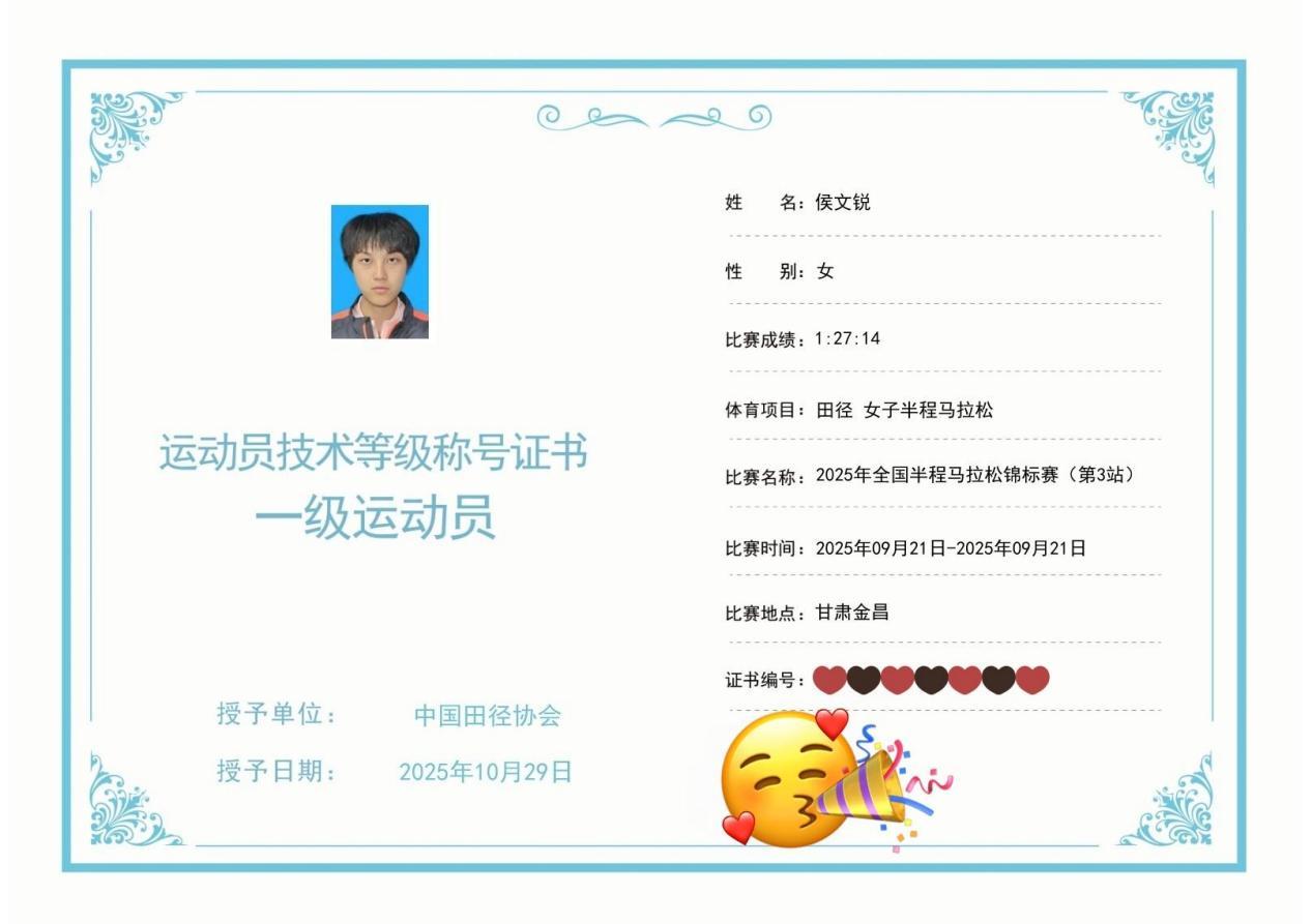 获“国家一级运动员”证书的侯文锐坦言:“这份荣誉是既是认可也是激励。下一步我将把重心回归场地赛,在首都高校田径运动会与全国赛事中取得更加优异的成绩,努力为学校争光。”