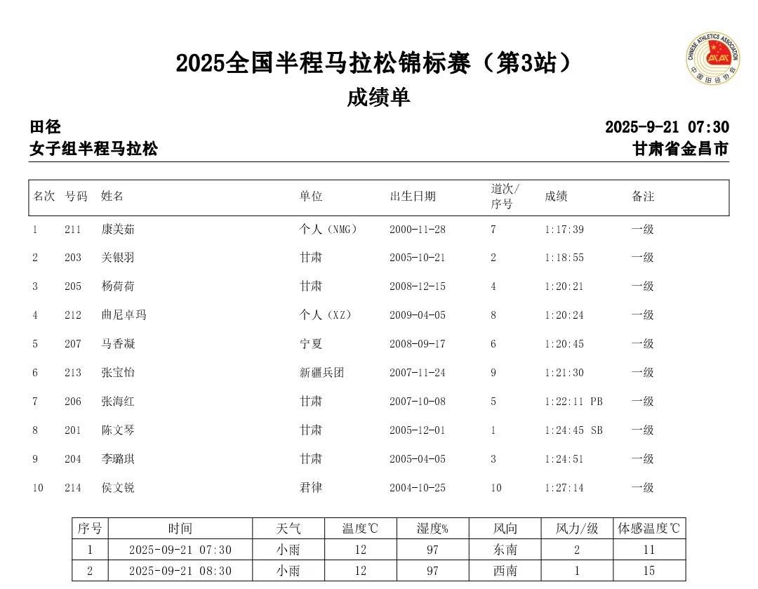近日,2025全国半程马拉松锦标赛在平均海拔1500米的甘肃金昌正式开赛。来自我校植物科学技术学院的侯文锐同学在雨中奋力奔跑,以1小时27分14秒位列女子组第十名,并凭借此次成绩获中国田径协会授予的“国家一级运动员”称号,侯文锐,好样的!