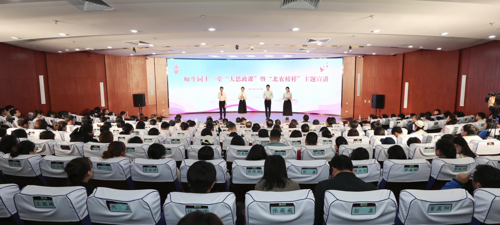 为深入学习贯彻党的二十届四中全会精神和全国全市教育大会精神,更好地落实立德树人根本任务、践行强农兴农时代使命,在全校大力营造风清气正、担当作为、实干创先的浓厚氛围,为持续推动学校事业高质量发展凝聚强大精神力量,11月13日,学校举办师生同上一堂“大思政课”暨2024-2025年度“北农榜样”主题宣讲活动。