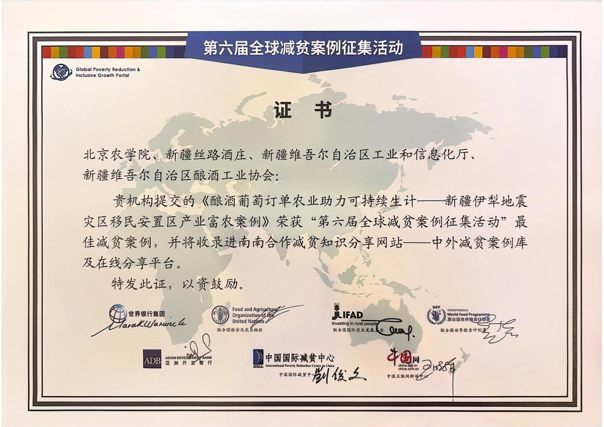12月10日,2025全球减贫伙伴研讨会在北京举行。会上公布了“第六届全球减贫案例征集活动”最佳案例名单并举行颁奖仪式。经过中国国际减贫中心、中国互联网新闻中心、世界银行、联合国粮食及农业组织、联合国世界粮食计划署、国际农业发展基金和亚洲开发银行等7家机构联合评选,北京农学院、新疆丝路酒庄、新疆维吾尔自治区工业和信息化厅、新疆维吾尔自治区酿酒工业协会联合申报的《酿酒葡萄订单农业助力可持续生计--新疆伊犁地震灾区移民安置区产业富农案例》从众多案例中脱颖而出,入选第六届全球最佳减贫案例。这是我校继2020年、2022年后第三次入选全球最佳减贫案例。