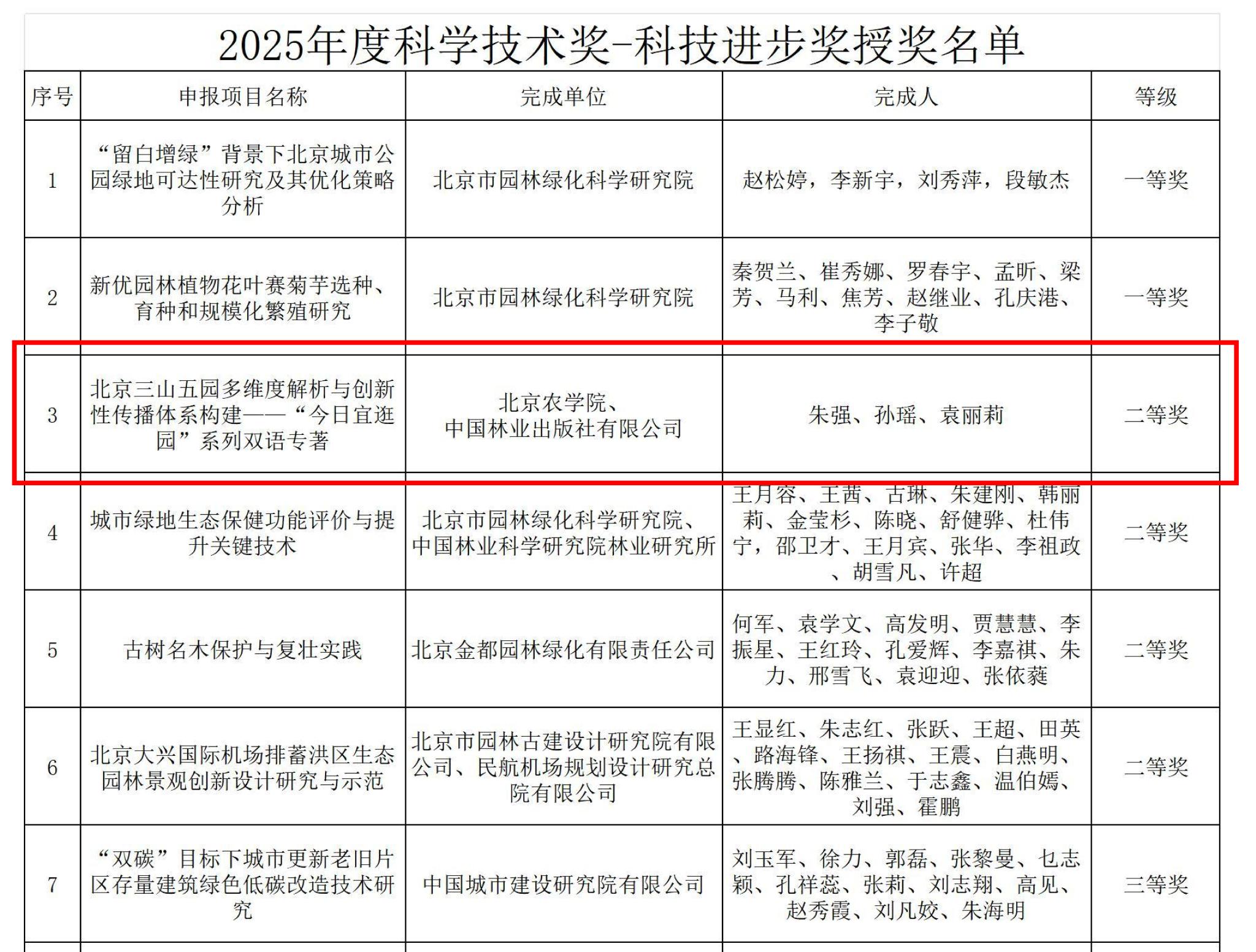 近日,2025年度北京园林学会科学技术奖评选结果揭晓,由北京农学院牵头完成、中国林业出版社有限公司出版发行的“北京三山五园多维度解析与创新性传播体系构建——‘今日宜逛园’系列双语专著”项目荣获科技进步奖二等奖。
