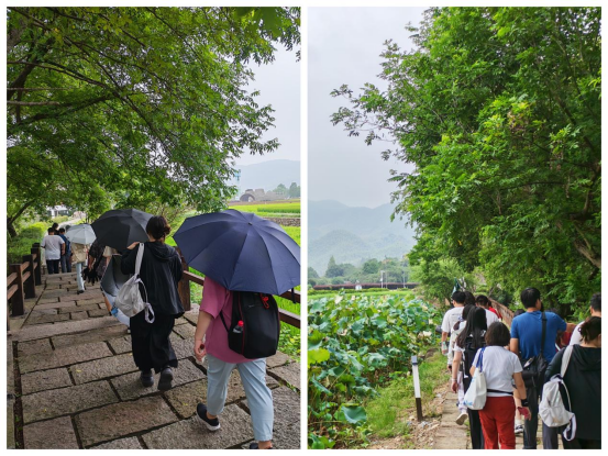 自由活动时间依然能够体现学校的“OBE”(成果导向教育)教学理念。同学们以小组形式展开实地作业:有的测绘记录村中“四旁绿地”与乡村公园,有的访谈村民与创业者,有的记录植物搭配与生态技术细节。尽管细雨不断,大家的调研热情却持续高涨。“每一处景观背后都是发展理念的支撑,我们要读懂的不仅是空间,更是人与土地关系的重构。”学生马梁瑞分享道。