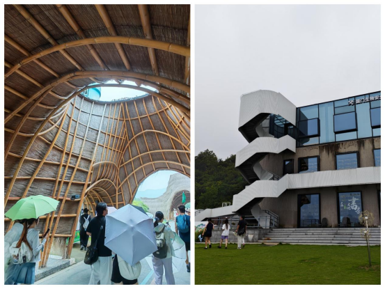 村史馆内,图文资料与实物展陈再现了余村从“石头经济”到“生态经济”的转型历程;景观稻田区展现了农田景观化、生产与观光结合的新模式;而多处由高校团队参与设计的竹构建筑小品,则让同学们看到专业设计力量在乡村建设中所能发挥的作用。在由废弃水泥厂改造而成的印象青年图书馆,同学们仔细观察建筑如何通过保留工业遗存、植入竹木材料、采用自然采光通风等策略,实现功能置换与低碳转型。“百闻不如一见,漫步村中,我深刻感受到了生态环境与经济发展之间的良性互动。”同学曹晟桐在实习笔记中写道。