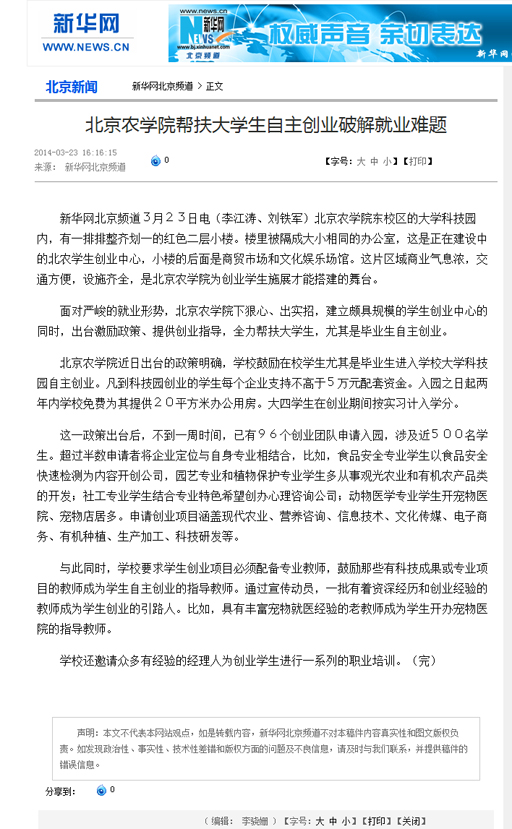 【新华网】北京农学院帮扶大学生自主创业破解就业难题
