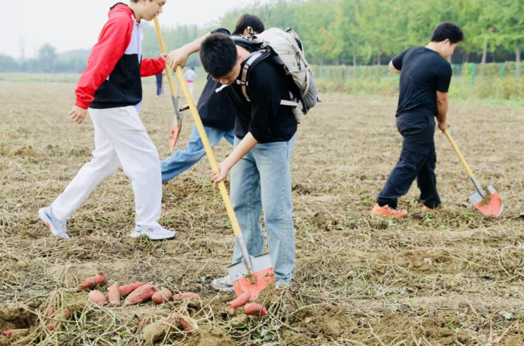 在一旁的红薯田里,来自北京大学、北京科技大学和北京体育大学的师生们,正俯身进行着一场细致的“地下寻宝”。按照老师教的方法,同学们纷纷行动起来。先找到红薯的根,在距离根系约10到15厘米的位置,从四周将铁锹稳稳插入土中,深沉发力向下掘,再借力向上一撬,红薯就被顺利挖出。