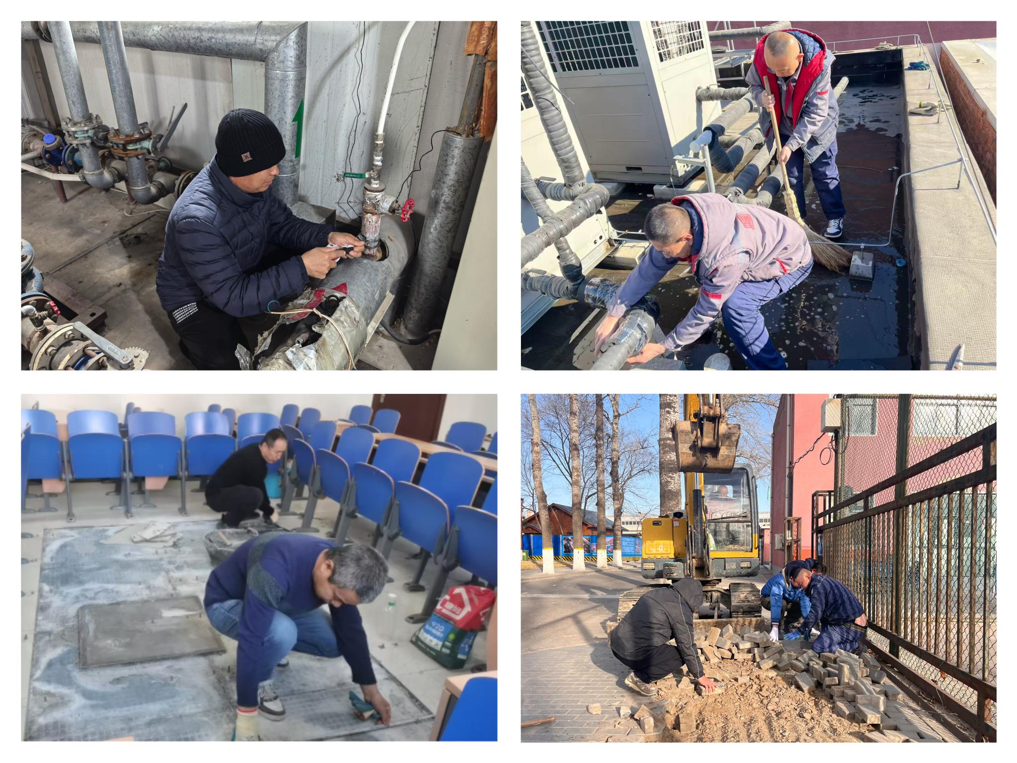 后勤职工对配电室、充电桩等电力设备及锅炉房、上水泵房、热泵房等关键能源站点进行了全覆盖巡检。维修师傅们穿梭于各楼宇之间,手摸眼看、逐一测试,对水电基础设施进行全面“体检”,及时修复跑冒滴漏及线路隐患。同时,对各楼宇的暖气、桌椅进行了细致检修与加固,确保返校师生第一时间就能在温暖舒适、设施完备的环境中开启新学期。