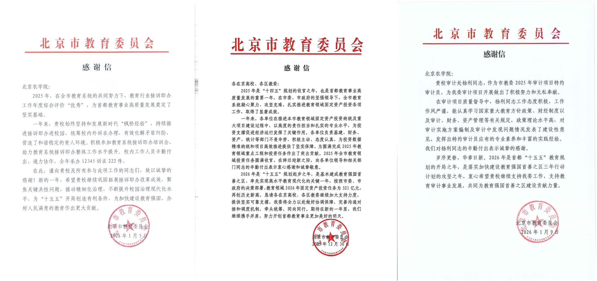 学校始终坚持和发展新时代“枫桥经验”,持续推进接诉即办进校园,统筹校内外诉求办理,有效化解矛盾纠纷,营造了和谐稳定的育人环境。在推进北京市教育领域固定资产投资纳统及重大项目建设过程中,学校积极参与教育领域教学科研设备更新工作,以高度的责任担当和扎实的专业水平,组织学校设备更新项目申报,为投资支撑促进经济运行作出积极贡献。我校审计处杨利同志作为市教委2025年审计项目特约审计员,为市教委审计项目开展做出了积极贡献。北京市教委来信感谢我校为2025年首都教育行业接诉即办、教育领域固定资产投资和审计工作作出的贡献。