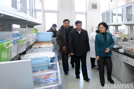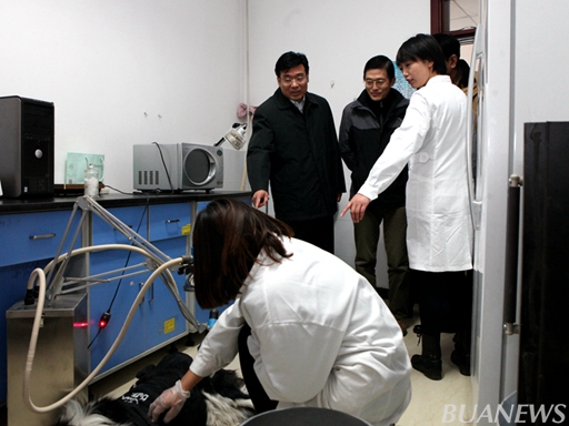 林克庆一行还来到动科楼,实地考察兽医学北京市重点实验室。动物科学技术学院院长郭勇介绍了兽医学(中医药)北京市重点实验室的情况以及动物医学、动物科学专业特色和发展前景。动物科学技术学院副教授董虹介绍了利用中医药服务畜产品安全和伴侣动物健康取得的科研成果。在实验室,林克庆书记实地查看了学生对动物进行的艾灸治疗,并与学生进行亲切交流。