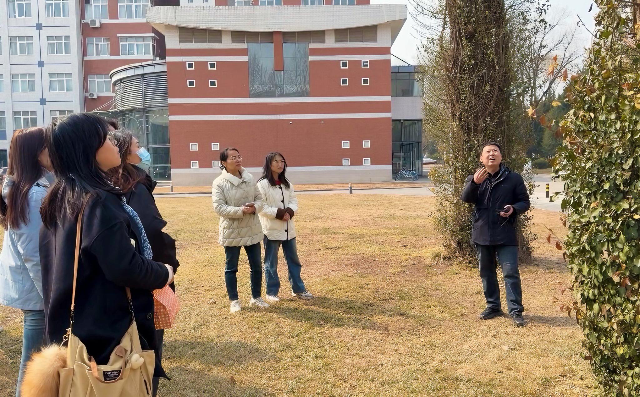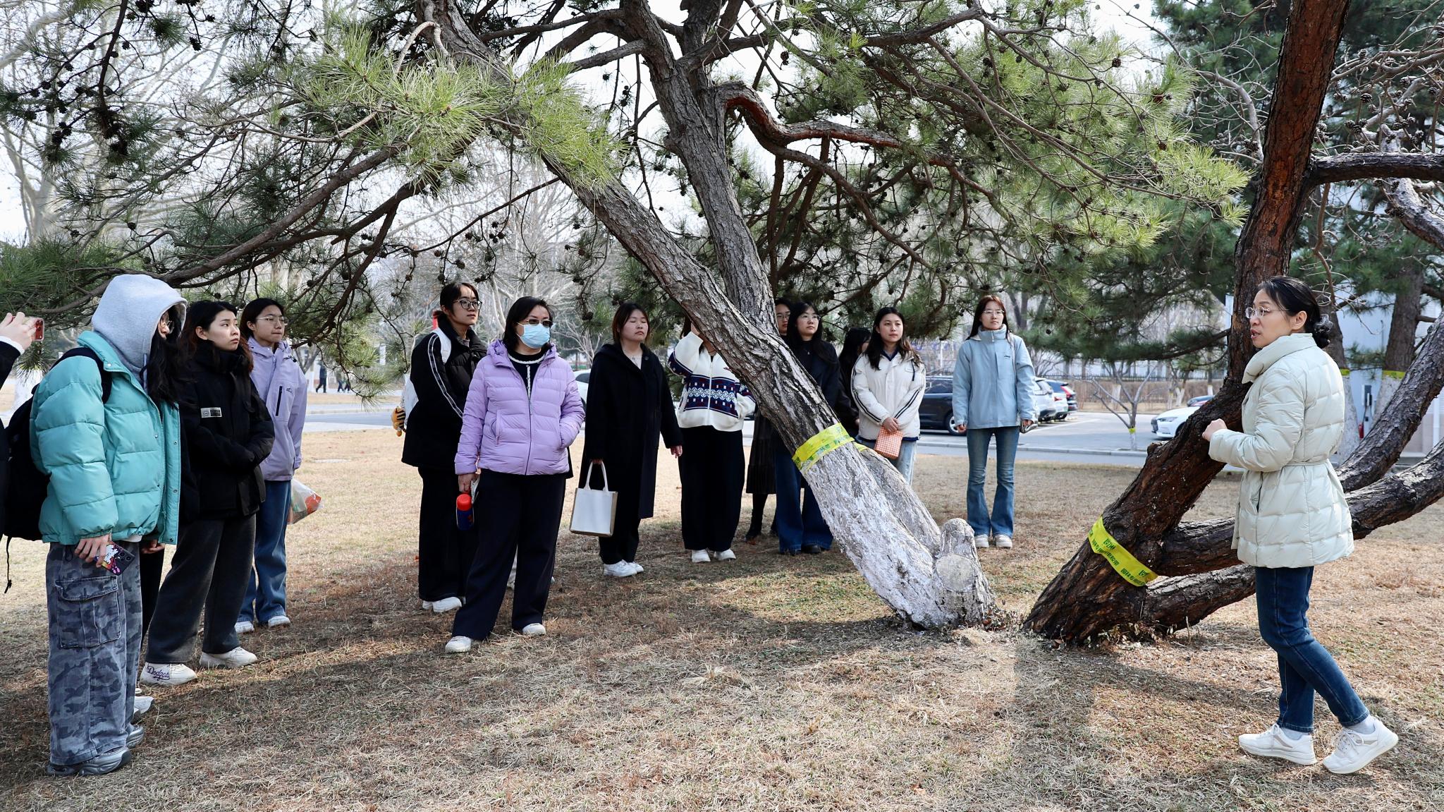 在学校礼堂前,生物与资源环境学院组织了别开生面的“识树医木”活动。学校植物健康研究院的赵晓燕教授、任争光副教授、李迁副教授,带领同学们漫步校园,逐一“问诊”路边的树木。在一棵松树前,老师们停下脚步,轻轻剥开一块树皮,向同学们示意:“你们看,这里有蛀干害虫的痕迹。病虫害防控的关键在于‘早发现、早诊断’。”