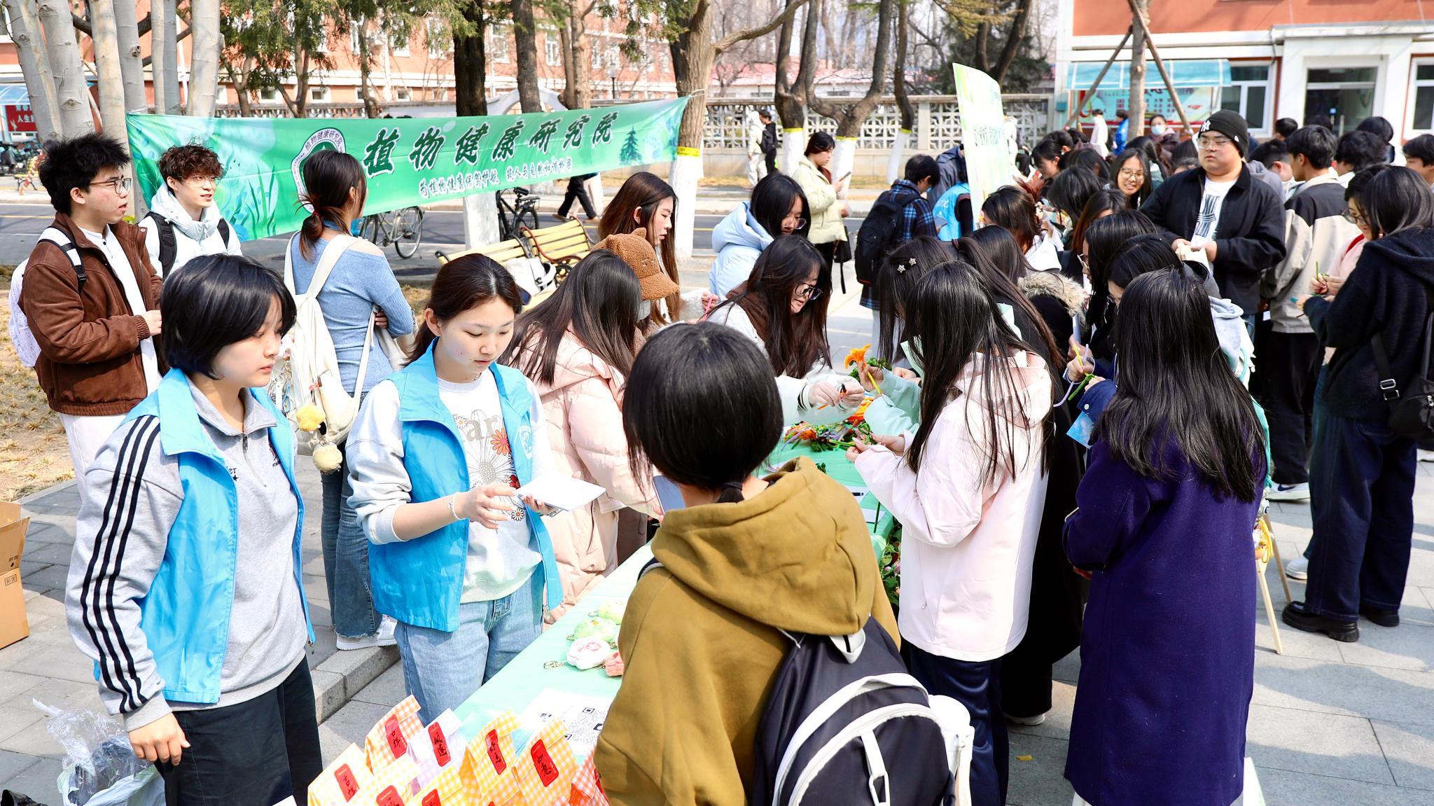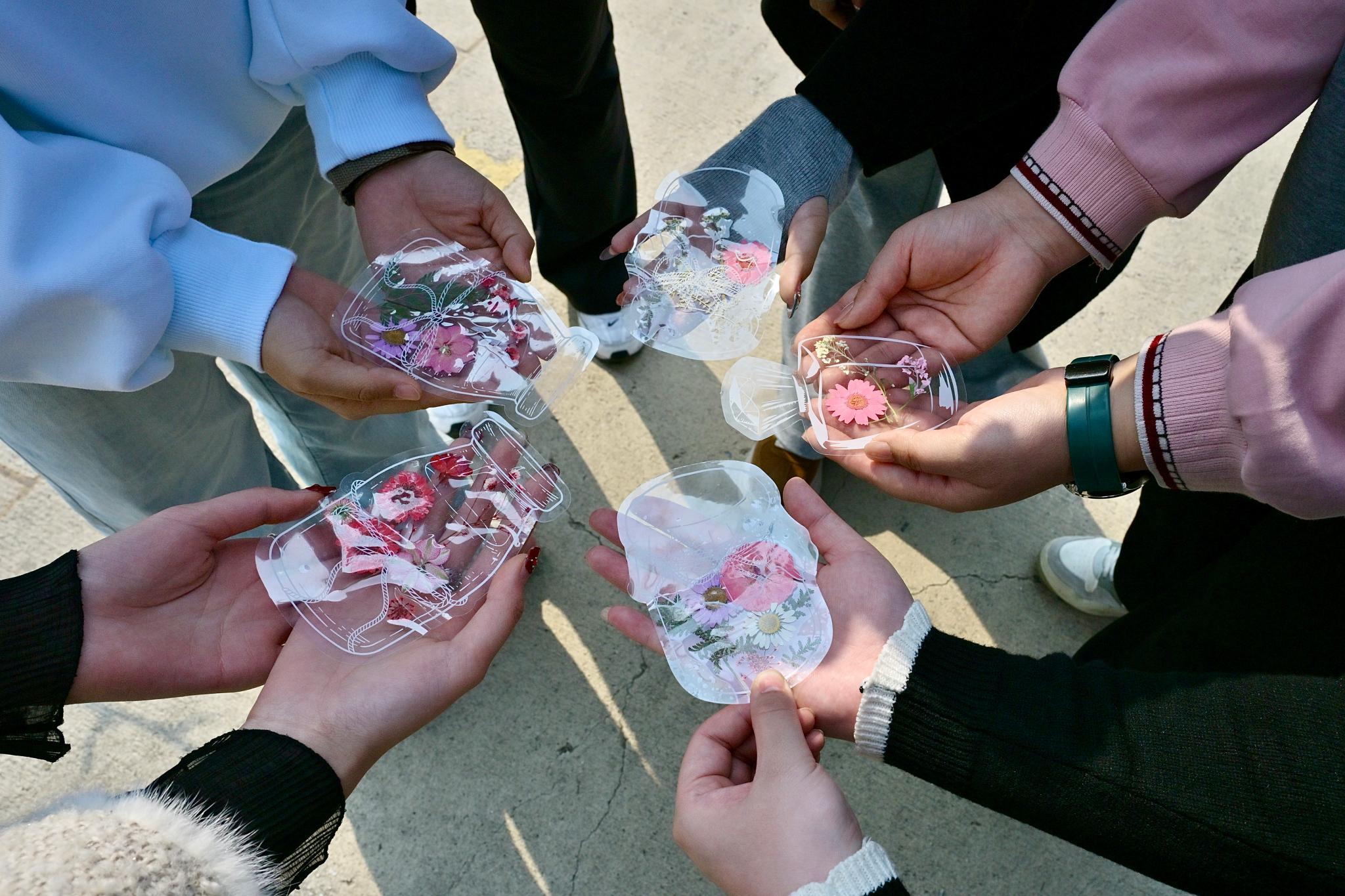 学习完果树剪枝,同学们体验起干花书签创作。师生们将压好的二月兰、迎春花花瓣小心翼翼地加入透明书签中,再用彩笔标注植物名称和采集地点。“这样就可以把北农的春天留在书页里。”大家纷纷举起刚做好的书签拍照留念。