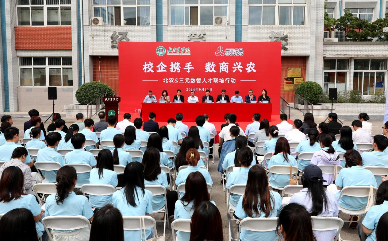 “数智三元”智慧牧业产教融合实践育人共同体由经济管理学院牵头,联合北京三元食品股份有限公司、大地群生养殖专业合作社、北京南北天地科技股份有限公司共同组建。创新性地构建了“高校+产业链龙头+一线牧场+数据科技平台”的“1+3+N”协同育人新模式。覆盖乳业“生产-加工-销售-数据”全产业链,为学生提供从牧场管理、生产加工、企业管理到产业大数据分析的全景式、浸润式实践场域。将产业前沿需求、真实项目数据与高校人才培养体系深度融合,打造机制共建、资源共用、成果共享的产教融合典范。
