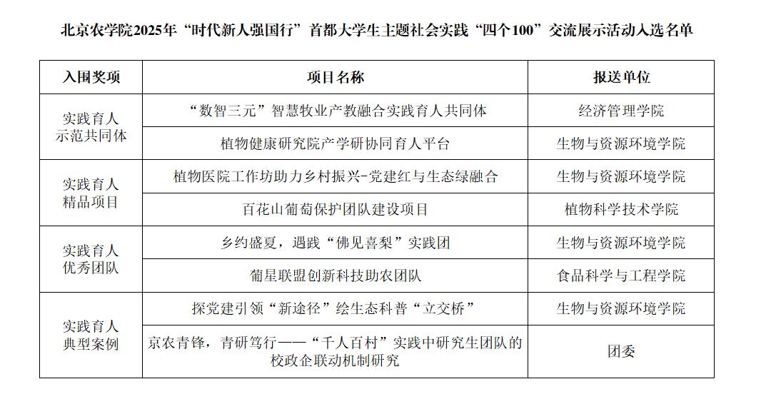 近日,北京市委教育工委公布了2025年“时代新人强国行”首都实践育人“四个100”交流展示活动的入选名单,学校共有8个项目入选覆盖“四个100”全部类别。